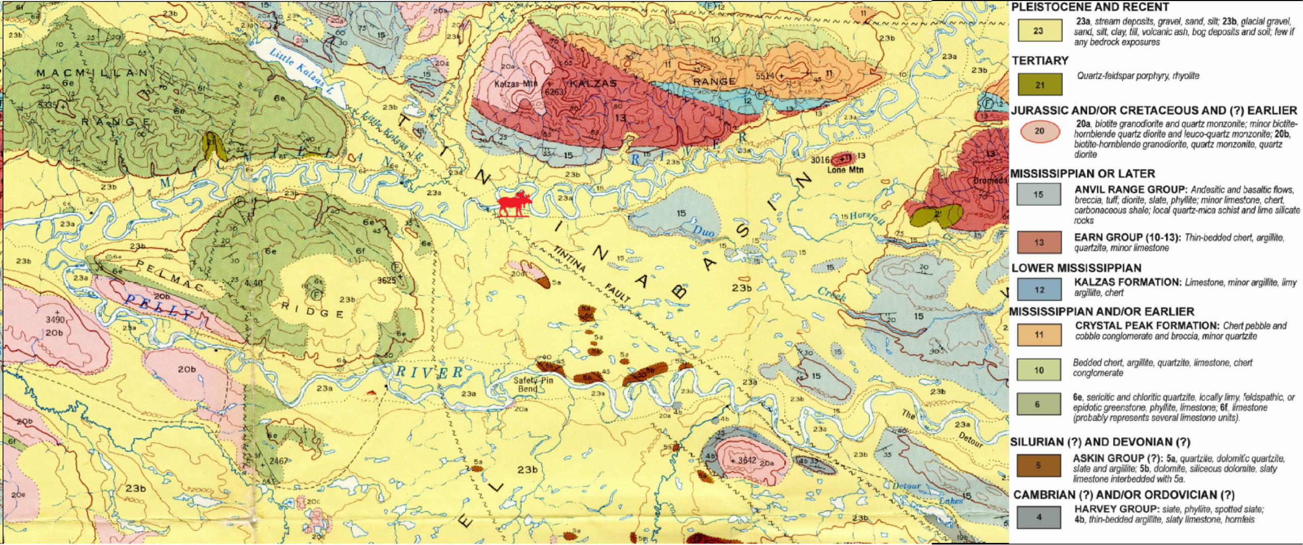 The bulk of the exposed bedrock on Kalzas Mountain is made up of the Earn Group (mapunits 10-13), composed of westerly-derived upper Paleozoic clastic sediments. Map units 4-6 southwest of Tintina Fault were considered lower Paleozoic based upon their similarity to those in more distant, less metamorphosed areas. The intruding granite plutons are shown in pinks, but their ages were undefined.