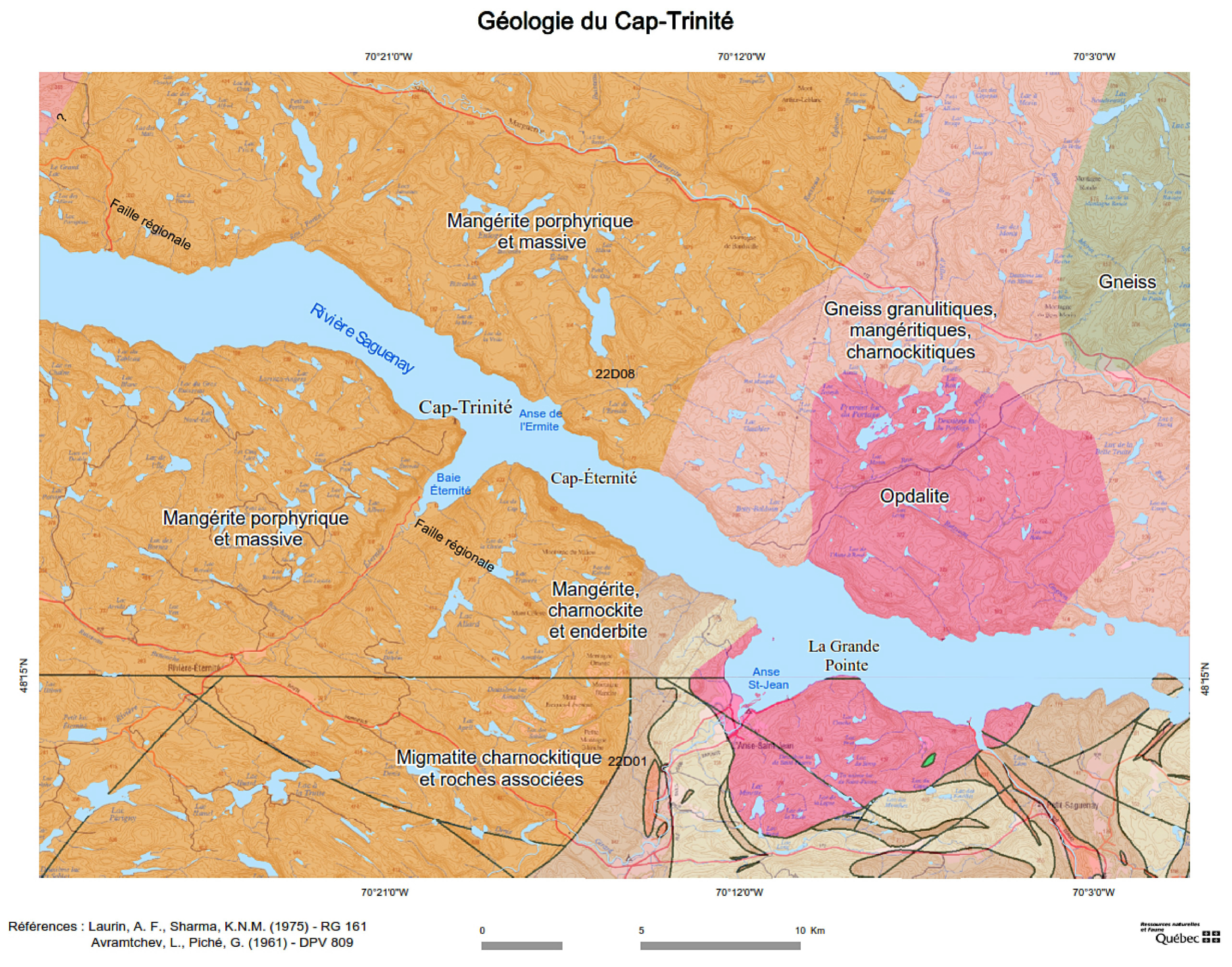 Exposed roots of Precambrian mountains; development of Saguenay Graben; Pleistocene glaciation and isostatic rebound